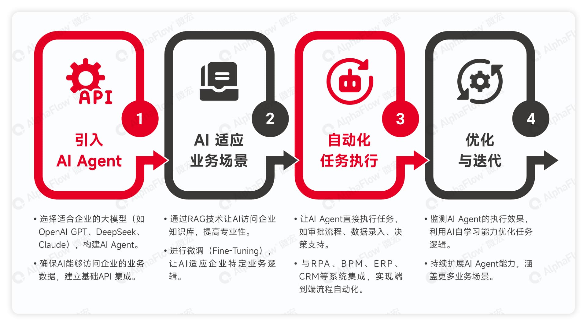 通过RAG(检索增强生成)和微调(Fine-Tuning),AI适应企业专属知识,实现个性化任务执行。