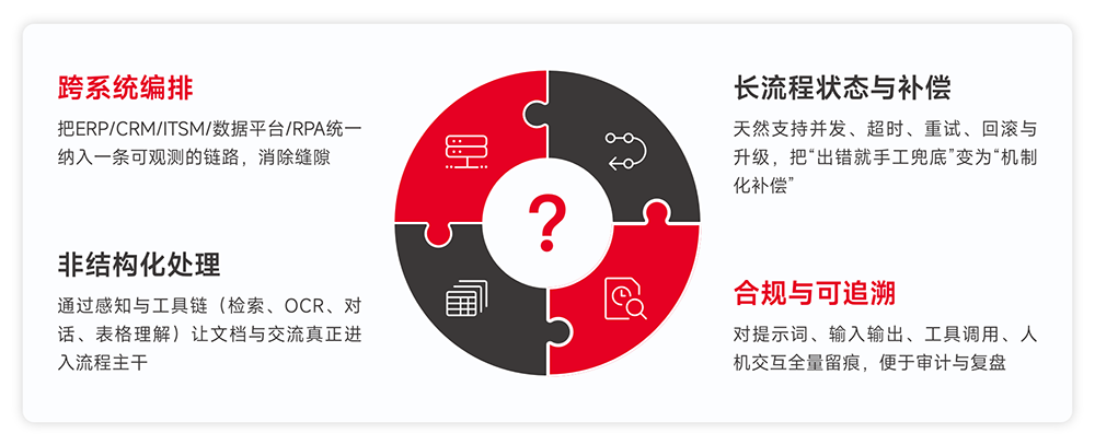 长流程状态与补偿:天然支持并发、超时、重试、回滚与升级,把“出错就手工兜底”变为“机制化补偿”。