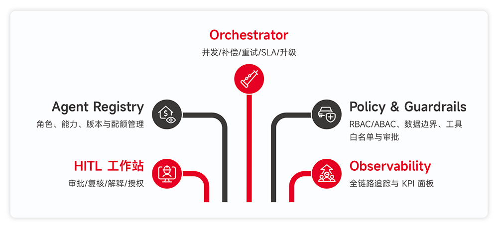 跨系统编排:把 ERP/CRM/ITSM/数据平台/RPA 统一纳入一条可观测的链路,消除缝隙。